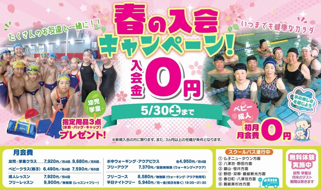 2026年3月11日 / 最終更新日時 : 2026年3月24日 wpmaster-ogawa お知らせ 春の入会キャンペーン 3月20日(金) 受付開始 ・泳げるようになりたい・プールに通いたい・泳げないと不安・久しぶりに泳ぎたい・健康のために水中運動を始めたいこの機会に始めてみませんか キャンペーン特典 【幼児・学童】◎入会金 0円◎水着・スクールバッグ・スイミングキャップ プレゼント※幼児・学童クラスは入会制限の曜日もありますので、事前にご確認ください 【成人・ベビー】◎入会金 0円◎初月月会費 0円 ※新規入会の方に限ります。また、3カ月以上の在籍が条件となります。※5月30日(土)まで